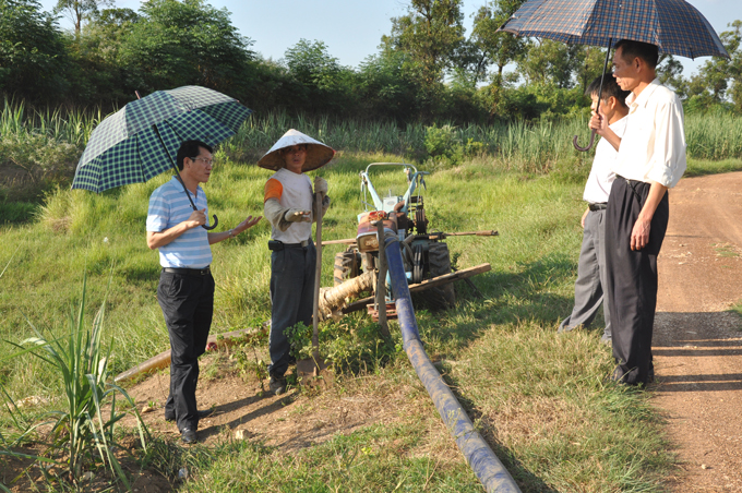 场长李震带队到分场了解职工抽水抗旱情况。(摄于2012年8月16日)