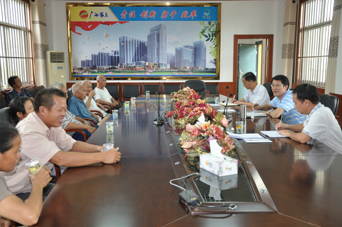 在融洽的气氛中,西江农场场长李震(右二)带领危旧房改造工作主要领导与职工面对面交流、沟通,共同做好危房改造工作(摄于2011年7月29日)。