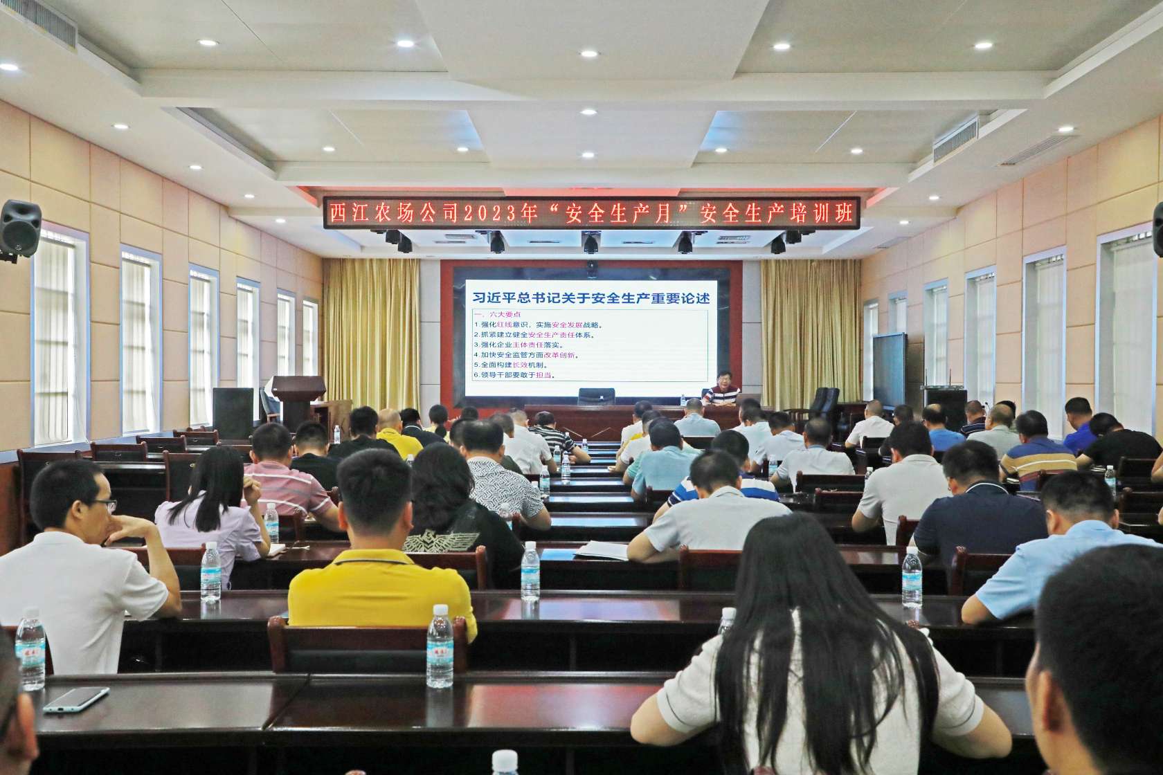 6月21日,西江农场公司举办2023年“安全生产月”安全生产培训班,邀请专家授课,学习习近平总书记关于安全生产重要论述、国务院安全生产“十五条硬措施”和区安全生产二十条细化措施,并组织观看《生命重于泰山》,进一步树牢“红线”思维,守住安全“底线”;组织公司安全生产工作有关人员(约40人)到电影院观看安全警示电影《生命的代价》,强化全员安全生产红线意识;专题通报宁夏银川烧烤店燃气爆炸事故相关情况,警示各单位吸取事故教训,举一反三,自查自纠,切实防范遏制各类安全生产事故发生。